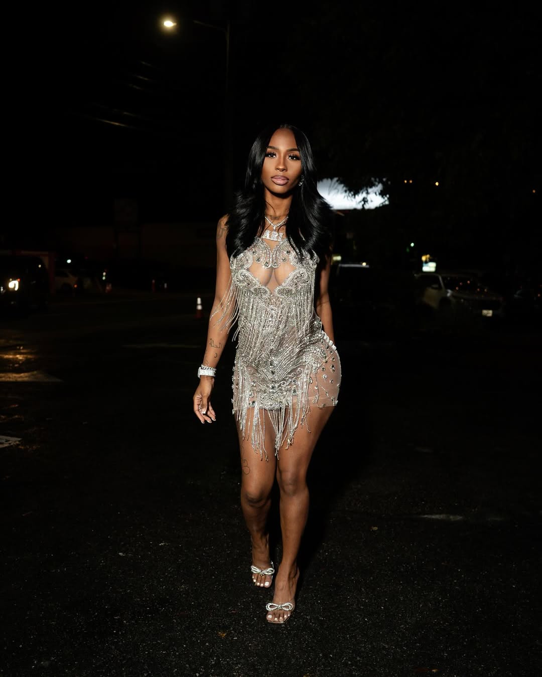 Turn heads and light up every room in the mesmerizing “Nova Dress.” This radiant mini is engineered to dazzle from every angle, with a front panel drenched in brilliant rhinestones and long, cascading rhinestone fringe that drips with every step—creating a kinetic shimmer that’s impossible to ignore. A flirty heart‑shaped cutout at the center adds just the right touch of playful allure.